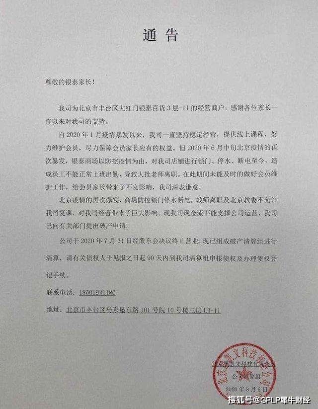 8月5日,北京市大红门银泰巧虎门店的经营商户——北京思凯文科技有限公司发布通告称,由于现金流不能支撑运营,已经向有关部门提出破产申请,并且,已经于7月31日经股东会决议中止经营,现已组成破产清算组进行清算。