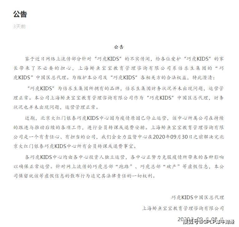 此外,公告表示,北京大红门银泰巧虎KIDS中心因为疫情原因已停止运营。巧虎KIDS中国区总代理会全力监督中心在2020年9月30日之前,解决完北京大红门银泰巧虎KIDS中心所有会员转课或退费事宜。
