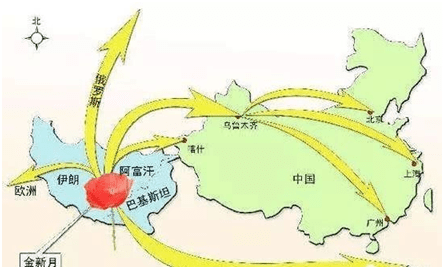 金新月包括巴基斯坦的西北边境省和俾路支省、伊朗的锡斯坦-俾路支斯坦省、阿富汗的雷吉斯坦和努里斯坦等地区,位于阿富汗、巴基斯坦和伊朗三国交接的地带,因地形像极了一轮弯弯的新月,又盛产利润极高的毒品,被称为“金新月”。