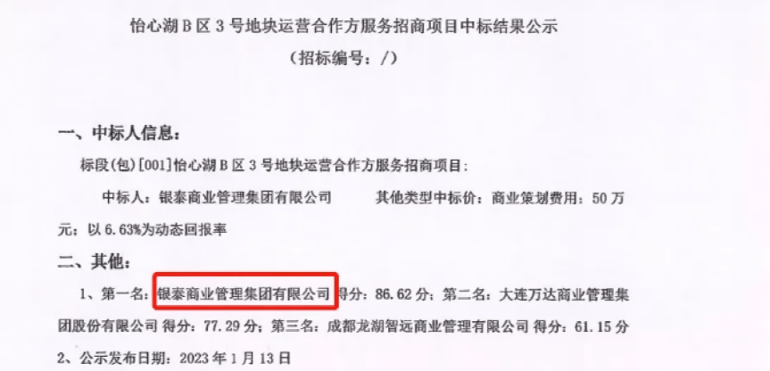 2023年1月份,怡心湖B区3号地块运营协作方服务招商项目中标成果公示,第一名便是银泰商业办理有限公司,第二名是大连万达商业办理集团有限公司,第三名是成都龙湖智远商业办理有限公司。