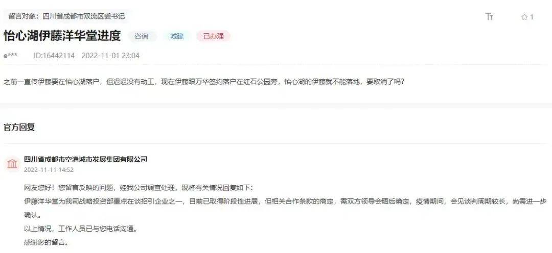 但事实上,怡心湖的商业仍在有条有理的推动中。就拿伊藤来说,成都空港城市开展集团有限公司清晰说过,包含伊藤在内的许多商业公司,都在接洽中,且已获得阶段性开展。而迟迟未能确认下来,仅仅由于与伊藤接见会面的高层都是日方作业人员,疫情期间交流不是很便利。